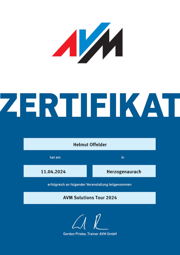 Zertifikat über erfolgreiche Teilnahme, ausgestellt am 11.04.2024 von AVM, Berlin.